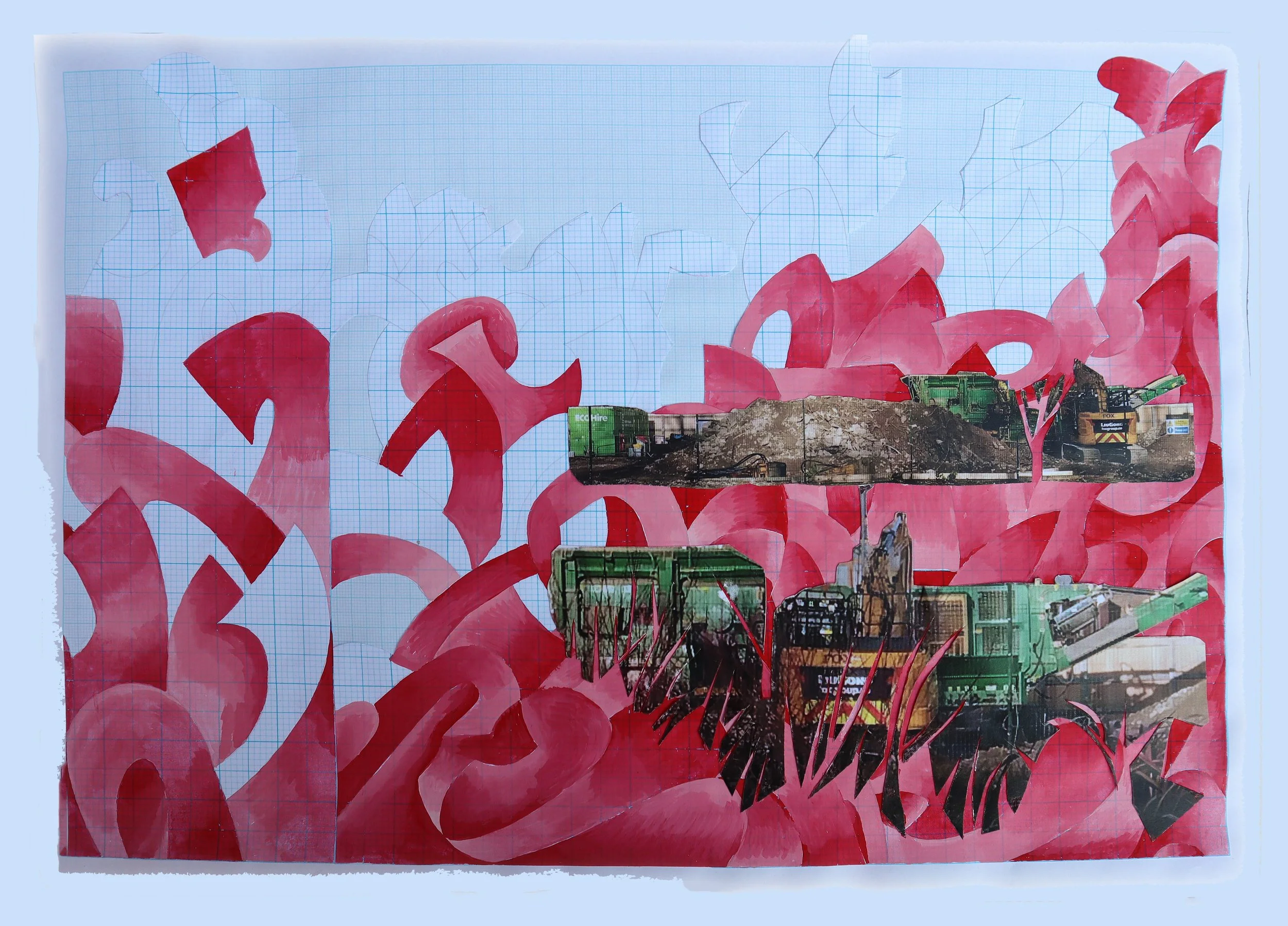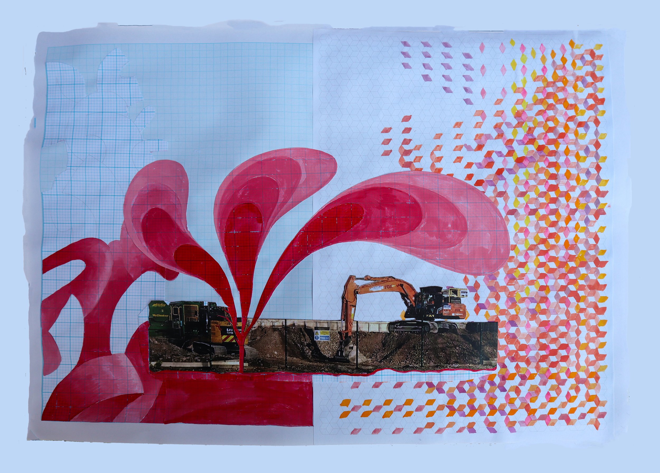 Josephine Manby Earth worked over, esquisse 1 (2026) gouache, pencil and collage on graph paper 29.7 x 42cm