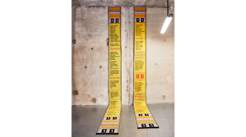 Hanging high on the wall begins Jane Lawson’s Cthulucene Domestic Heating Prototypes 2 (2025), tumbling onto the ground and extending into the floor space of the central room of the exhibition. Lawson deals in speculative fiction, and in possibly the most conceptually misty work in the exhibition, she imagines a future from which these works have been pulled, where humans have survived the climate crisis, and are now regenerating the Earth through renewable energies, foresting, and so on; though the work itself is a kind of decorated insulation, a machine knit made of wool and cotton, used domestically in this hypothetical future.
