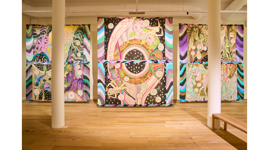 Similarly to Watkiss, Emma Talbot turns our attention to the sources from which we pull our cultural understandings of plants. Her contribution consists of three large paintings on silk, 21st Century Herbal (2022), that take on the qualities of a pharmacognosy textbook, or a herbal. The paintings are sprinkled with bubbles of text, detailing the medicinal effects of various plants, effects both scientific - ‘Antidepressant, helps PMS’ - and metaphysical - ‘Imbued with magical powers’, creating a herbal that pulls from folkloric history, not exclusively medical discovery.