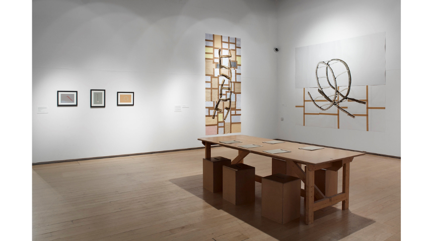 Additionally, Lathwood exhibits larger, collaged images of ladders, some in non-traditional shapes, including bent and broken ladders and rungs, some of which include the use of light fast, permanent oak gall ink to depict what can be broken through age and repeated use, and also shares the dead ends of circular ladders. These images have been created on large sheets of recycled paper: Lathwood notes that the mark making of the oak gall ink is stronger than the paper itself, which further raises questions about the longevity and impact of materials used to construct art works.