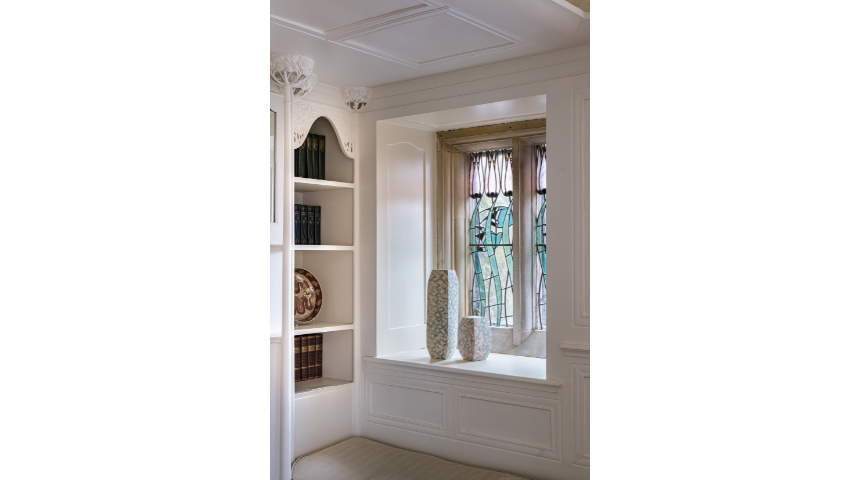 Priest feels hugely privileged to be showing work at the Blackwell as the building and the ethos of its architect, Mackay Hugh Baillie Scott, epitomise much of what she aspires to as an artist and craftsperson. He introduces romance and symbolism into elements such as wood-carving, leaded lights, ironwork, plasterwork and stencilled motifs. In each space, Priest’s designs sit in harmony with their surroundings. For her, to be able to situate her work in conversation with this building is very special. Harmony between time periods and styles is particularly evident in The White Room, a bright space set apart from the deeply coloured wood interiors of the rest of the building. Overlooking Lake Windermere, this room is calm with clean lines and serene natural sunlight that diffuses through stained glass to glance off Priest’s work. Here, she uses the reflected colours of the floral windows and the chalky white surfaces of the walls in pieces that look as if they have always been there.