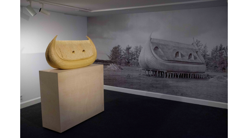 Starling’s works often have the weight and impact of an epic novel. Entering Gallery 5 of ‘Simon Starling: Boat Works’ at Abbot Hall, his 2023-24 work Houseboat for Ho: Presented by the Strawman is represented by a scale model of a reed boat that Starling built with a team of collaborators. He had been commissioned by the Danish Arts Foundation to create an artwork for the village of Ho in the Wadden Sea National Park, positioned on the south west coast of the Jutland peninsula, Denmark. The brief requested that the artist encompass the fact that Ho has an uncertain future due to climate change-induced flooding. The model, with its Cheshire cat smile, stands on a single plinth in the gallery, commanding a strange, inscrutable presence. Behind it is an inkjet printed vinyl wallpaper mural of a monochrome photograph of the IRL houseboat, standing in a field on its oddly millipede-like stanchions. These, Starling later explained, were formed so that rope could be passed underneath the boat during the construction process.